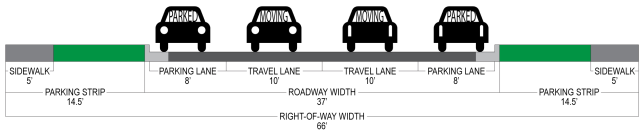 9.2.1. With parking on both sides of street: R-O-W width shall be 66 feet and roadway width shall be 37 feet.